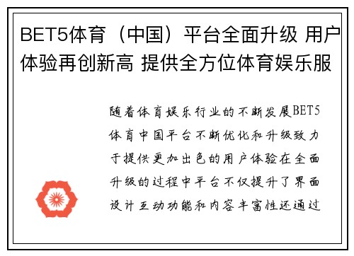 随着体育娱乐行业的不断发展,BET5体育(中国)平台不断优化和升级,致力于提供更加出色的用户体验。在全面升级的过程中,平台不仅提升了界面设计、互动功能和内容丰富性,还通过技术创新、个性化推荐等手段进一步拉近了用户与平台的距离。BET5体育(中国)平台全面升级的目标是为用户提供更加高效、便捷和全面的体育娱乐服务,涵盖从传统体育赛事到电子竞技、虚拟体育等多个领域,让每一位用户都能在平台上找到自己感兴趣的内容。本文将从四个方面详细阐述BET5体育(中国)平台的全面升级,以及这一升级如何实现用户体验再创新高,为用户提供更丰富、个性化的体育娱乐服务。