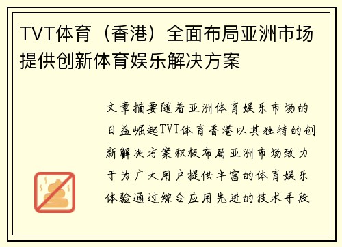 文章摘要:随着亚洲体育娱乐市场的日益崛起,TVT体育(香港)以其独特的创新解决方案,积极布局亚洲市场,致力于为广大用户提供丰富的体育娱乐体验。通过综合应用先进的技术手段,精细化的市场运营,以及多元化的合作模式,TVT体育不仅在香港本土取得了显著的成绩,也开始逐步向其他亚洲地区扩展。本文将从四个方面对TVT体育(香港)如何全面布局亚洲市场,提供创新的体育娱乐解决方案进行详细阐述,分别从技术创新、市场战略、用户体验、合作模式等方面进行深入分析。最后,我们将结合TVT体育在亚洲市场的布局,进行总结和展望。