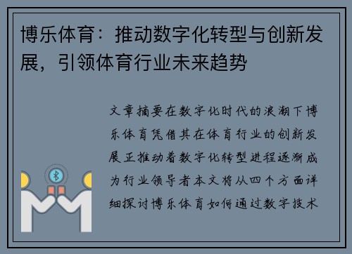 在数字化时代的浪潮下,博乐体育凭借其在体育行业的创新发展,正推动着数字化转型进程,逐渐成为行业领导者。本文将从四个方面详细探讨博乐体育如何通过数字技术驱动行业变革,引领体育产业未来的趋势。这四个方面分别是:数字技术在体育行业中的应用、创新商业模式和市场拓展、数字化转型对体育文化的塑造、以及如何在数字化转型中实现持续创新与竞争力提升。通过分析这些领域的深刻变化和博乐体育的实践案例,本文旨在展示其如何引领体育行业的发展方向,并预测未来体育行业将受到哪些趋势的深刻影响。通过这些内容,文章为体育行业的从业者与投资者提供了宝贵的战略视角和发展路径。